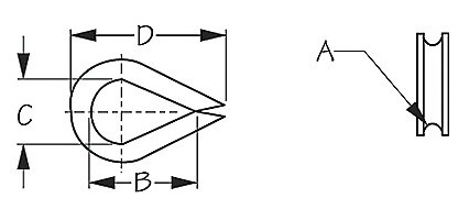 Light Duty Thimble (SeaDog)– Stamped Steel Hot Dipped Galvanized– A: 5/16″– B: 1-9/16″– C: 13/16″– D: 2-1/8″